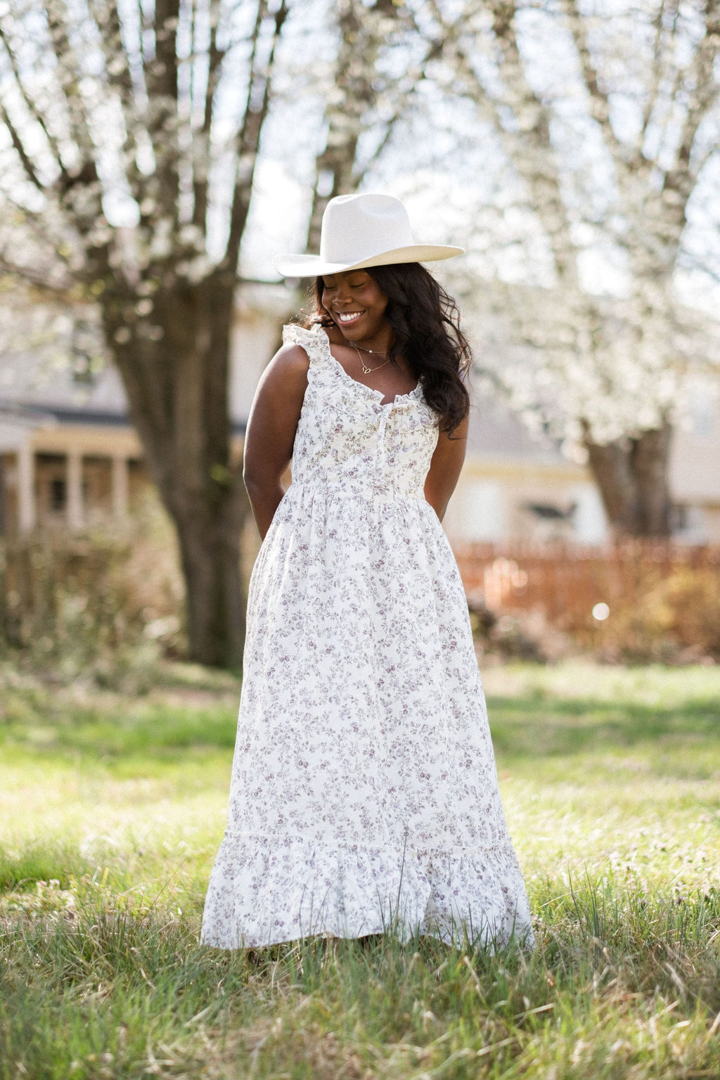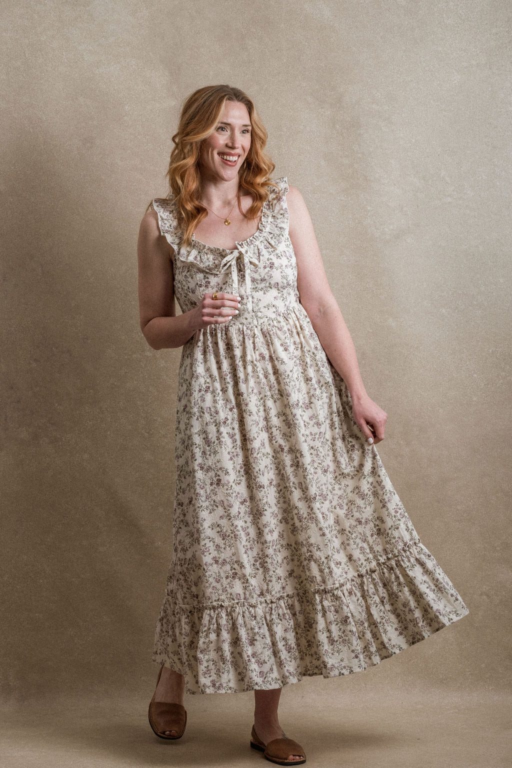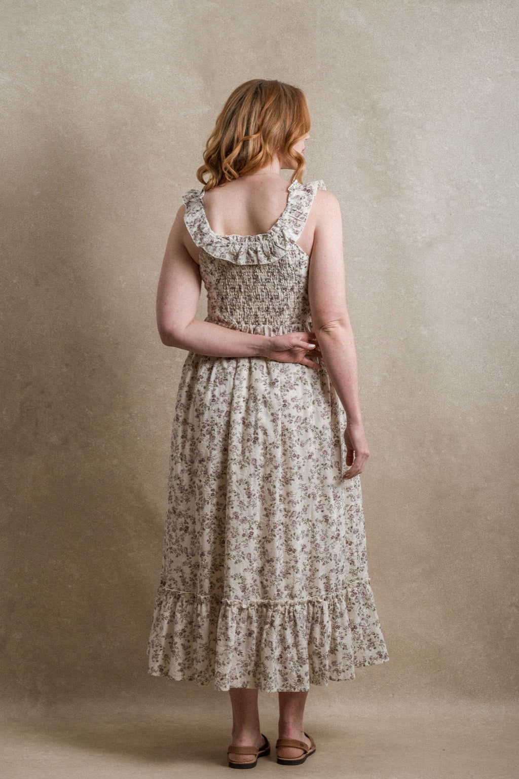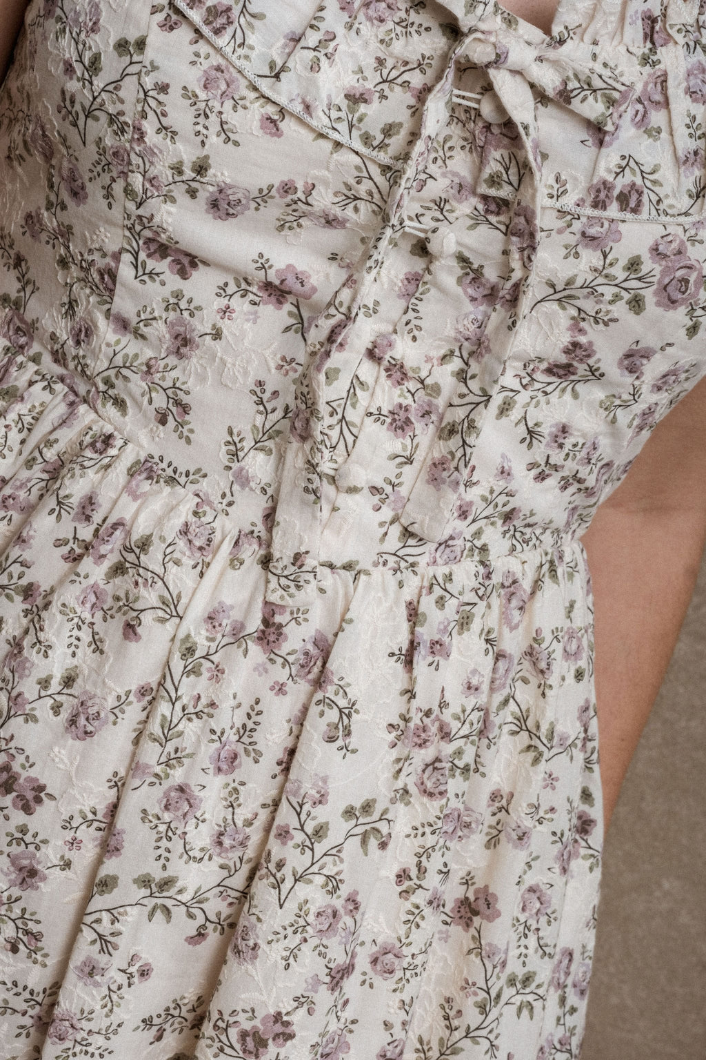 The Destin Dress in Lavender Floral is an effortless silhouette in a soft lavender print with embroidered white and lavender flowers throughout the fabric. It features an elastic scoop neckline and a lightly smocked back for an easy, flexible fit, along with functional buttons at the bodice with a privacy panel for additional coverage. Designed with a tiered skirt that moves gently with wear and finished with pockets for everyday ease. 3/4 lining adds coverage while keeping the feel airy and comfortable throughout the day.