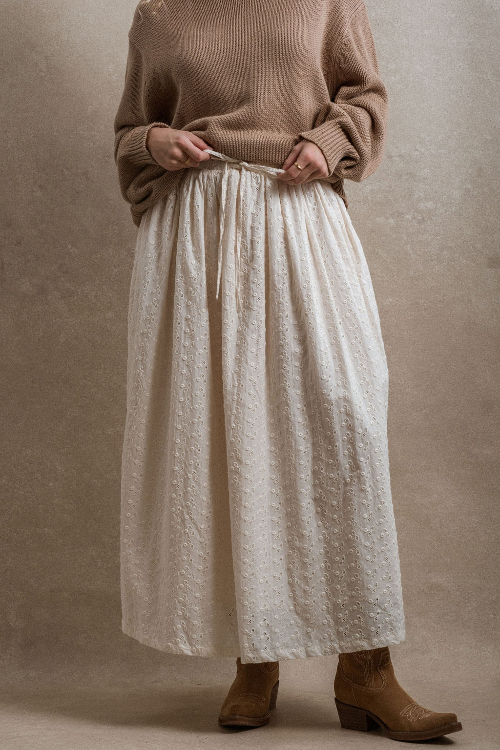 - The Overland Skirt is a wardrobe staple with eyelet detailing throughout for a touch of delicate texture. Fully lined for comfort and coverage, it features functional side pockets and a drawstring waist for an adjustable, flattering fit.