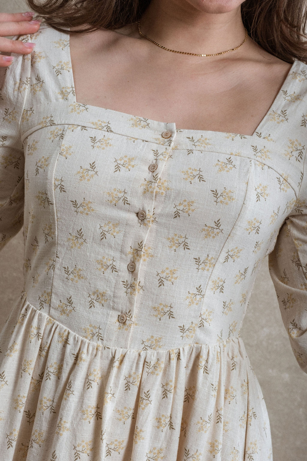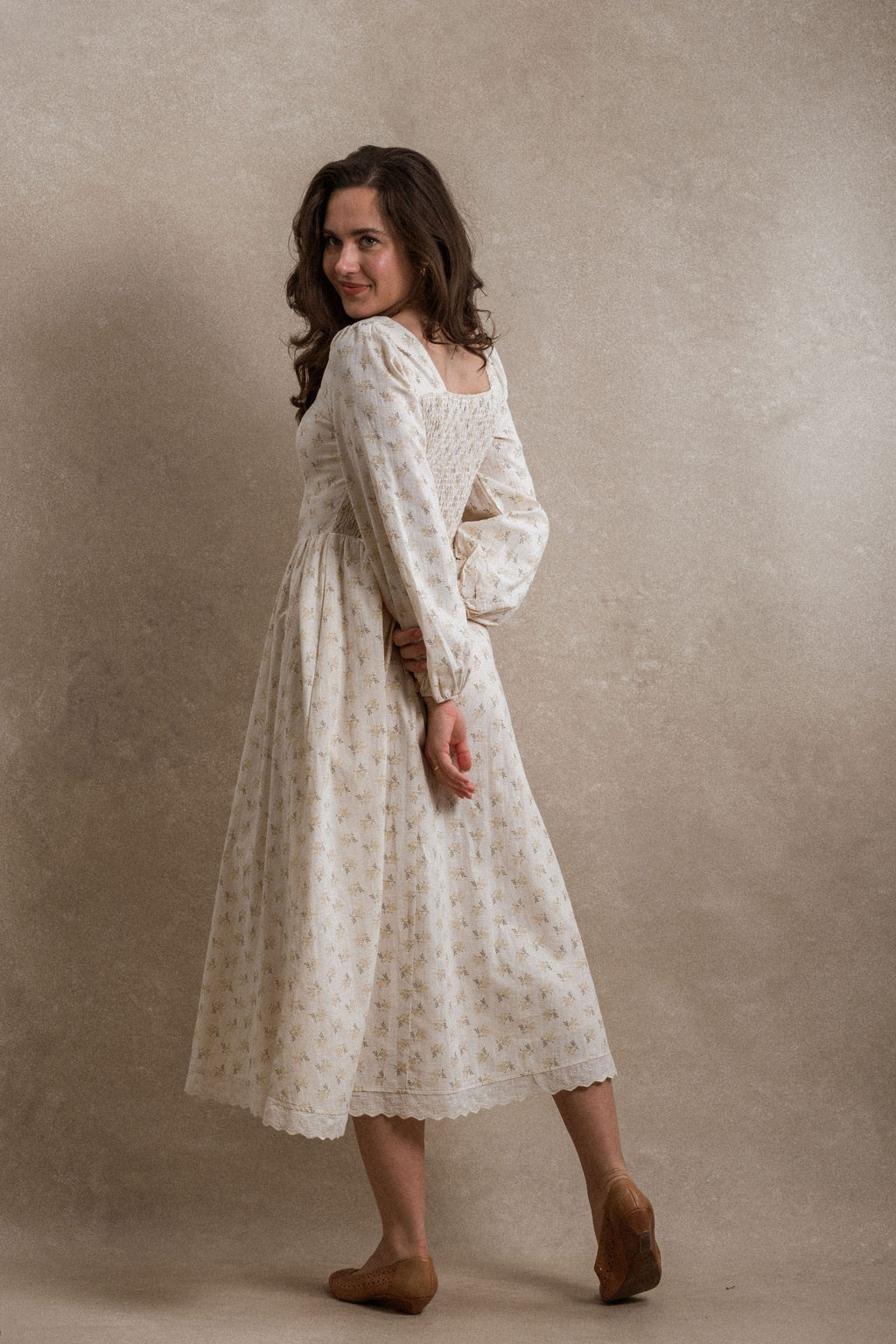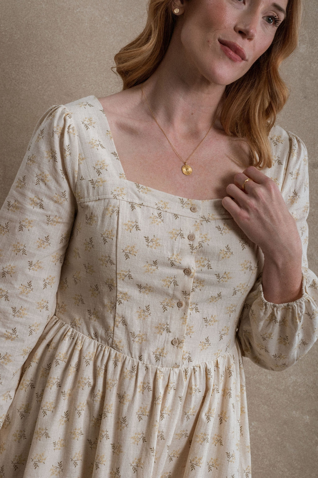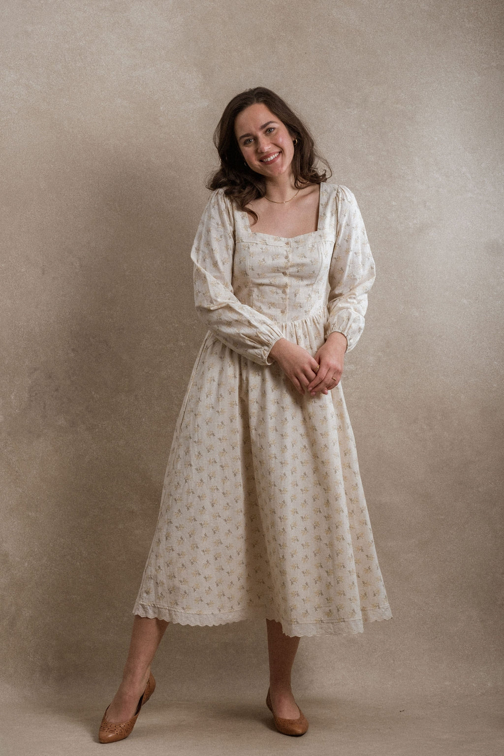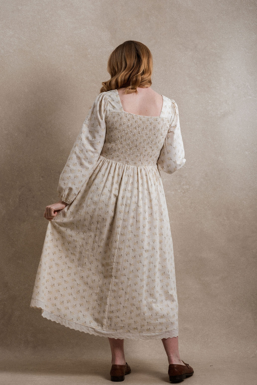- Say hello to the Astoria Dress, where classic charm meets everyday comfort. The structured front keeps things sharp and flattering, while the smocked back gives you that stretchy, easygoing feel we all love. Pretty marigold colored florals add a sweet pop of detail. This dress also features pockets, and is fully lined. This piece is nursing friendly.