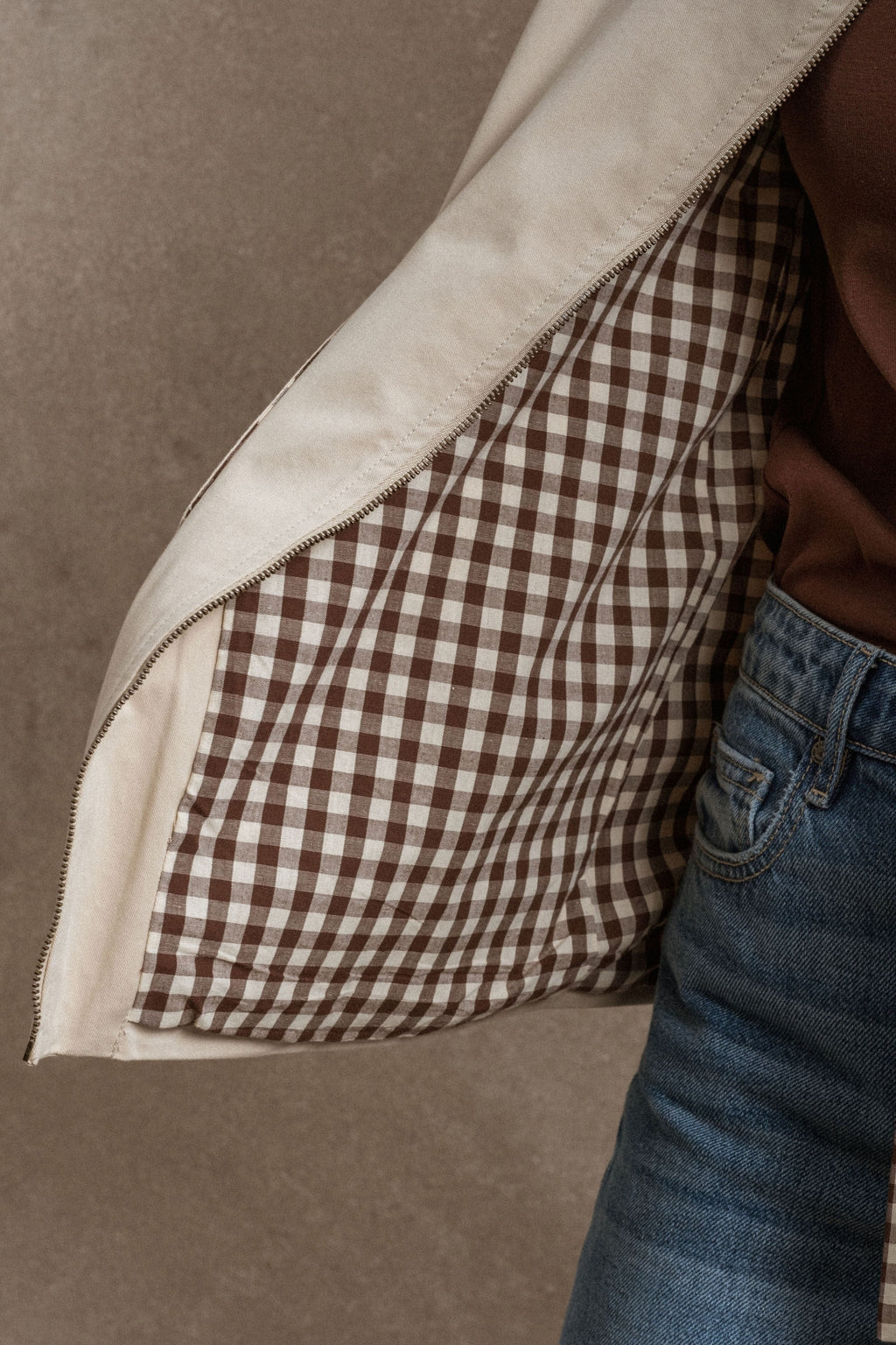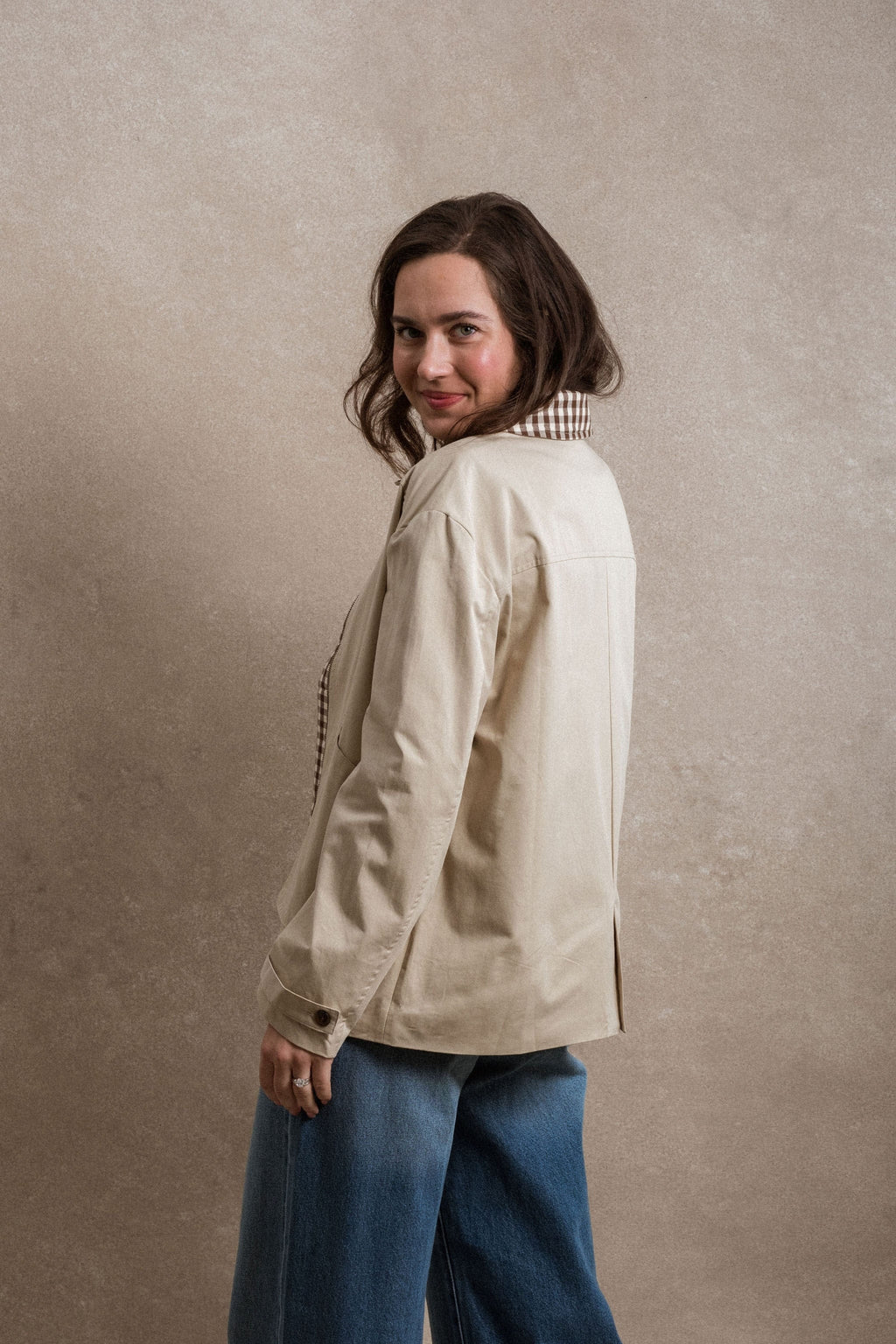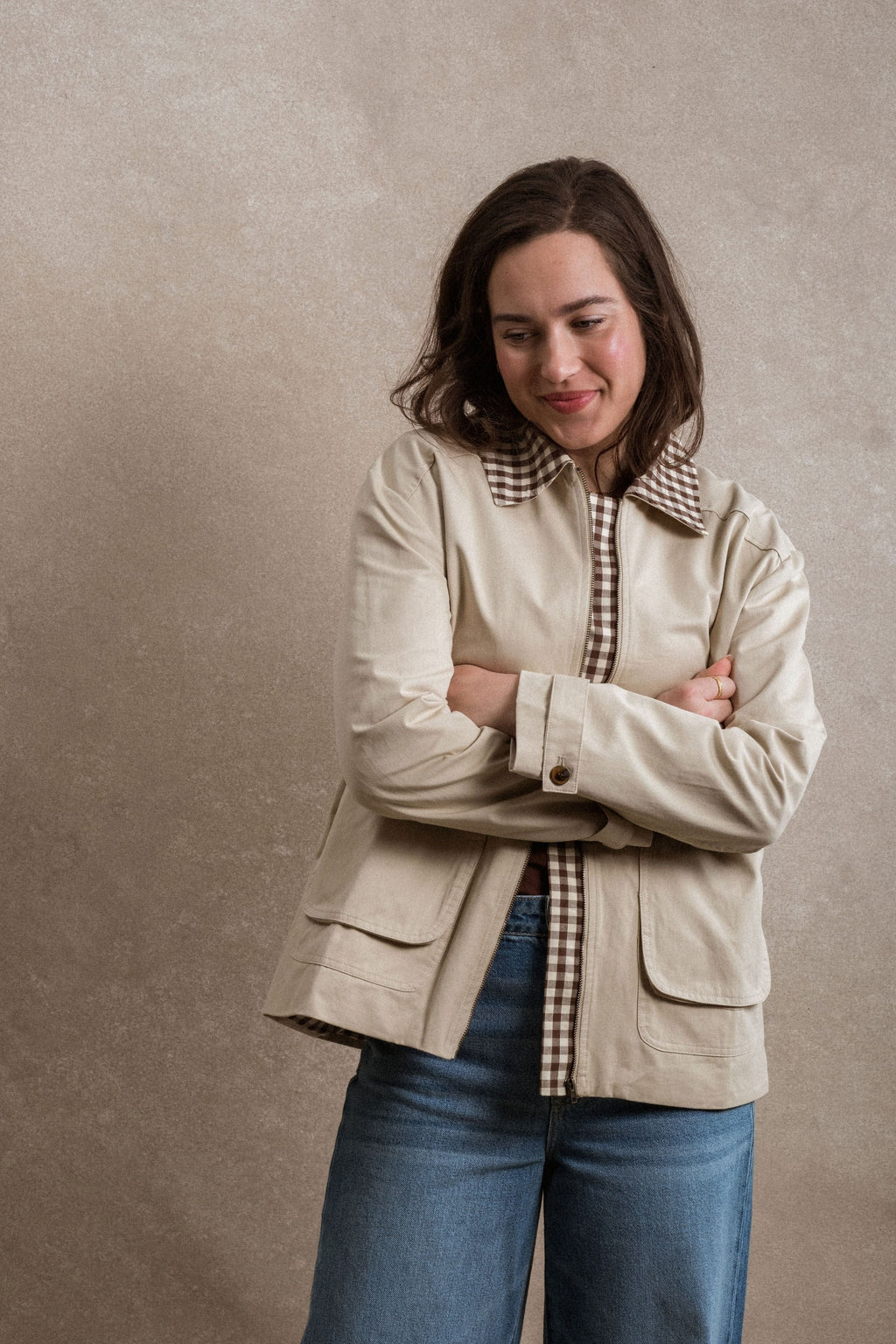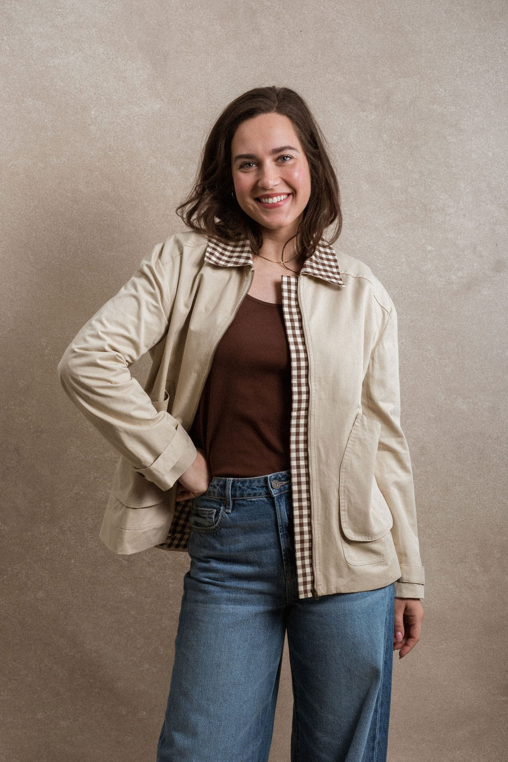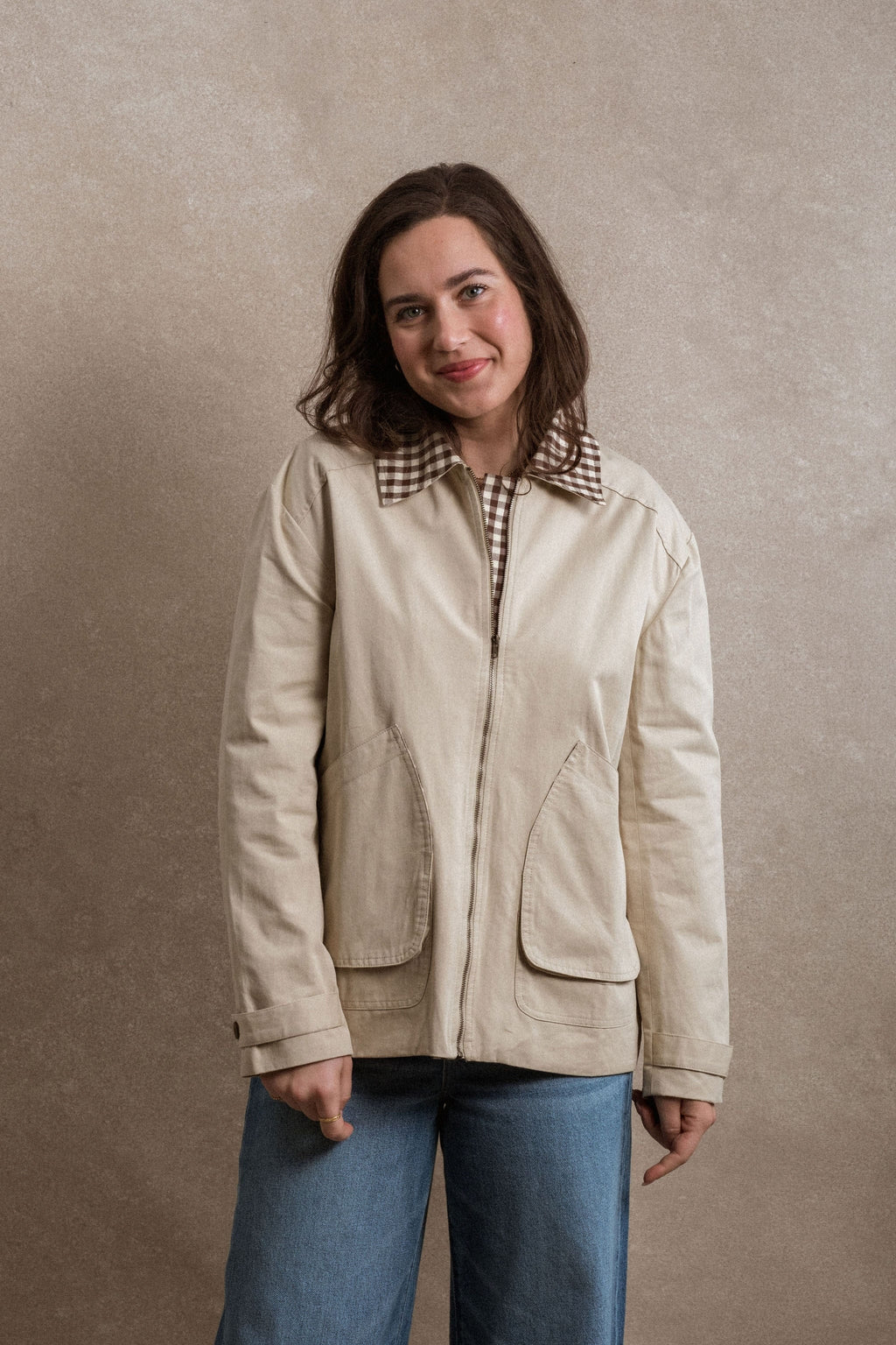 - The Edie Jacket is a timeless outer layer designed for everyday wear. Made with a durable khaki canvas body, it offers structure while remaining easy to layer. A gingham collar and matching lining add a subtle contrast and classic detail. Finished with functional front pockets and a front zipper, the Edie Jacket is a versatile piece that pairs effortlessly with pieces you already own.