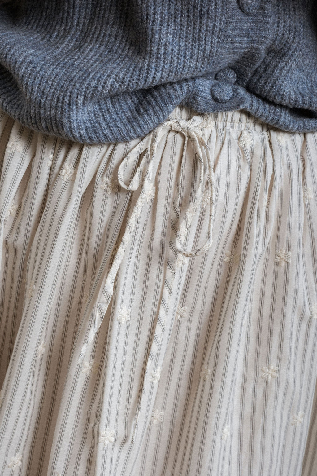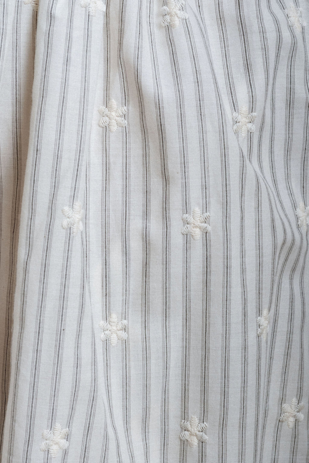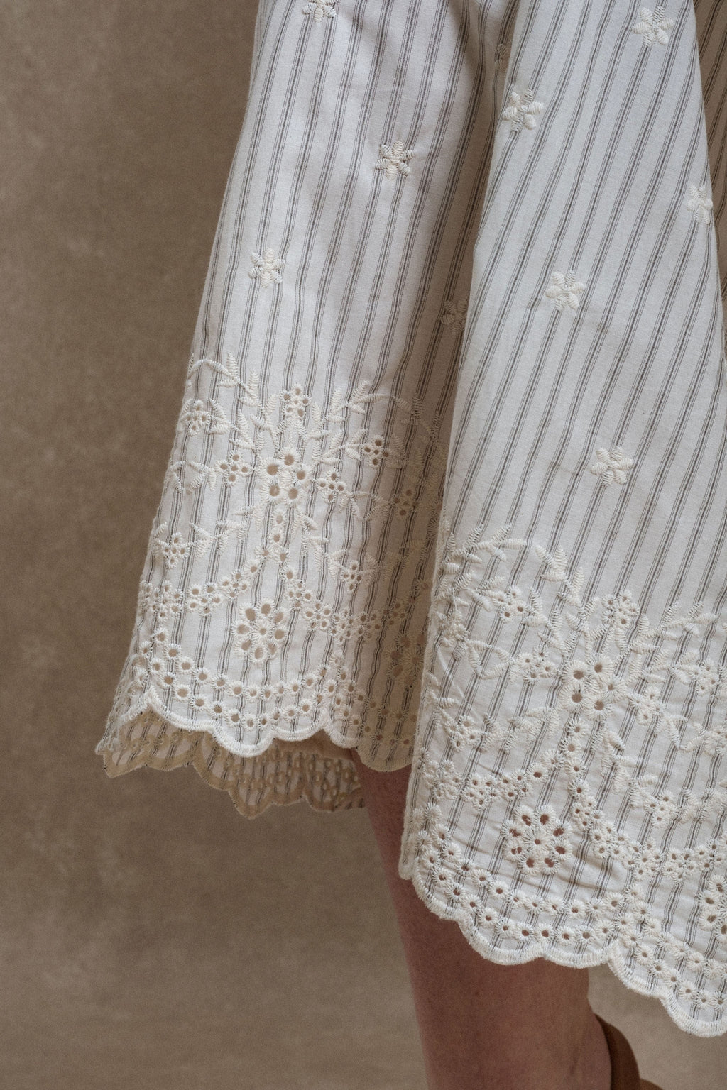 - The Granada Skirt pairs an elegant cream base with subtle black and charcoal pinstripes with scallop eyelet floral details along the hem, creating a delicate, feminine finish. Fully lined for comfort and ease of movement, it also includes pockets for practicality, offering a timeless piece that blends classic structure with gentle, thoughtful details.