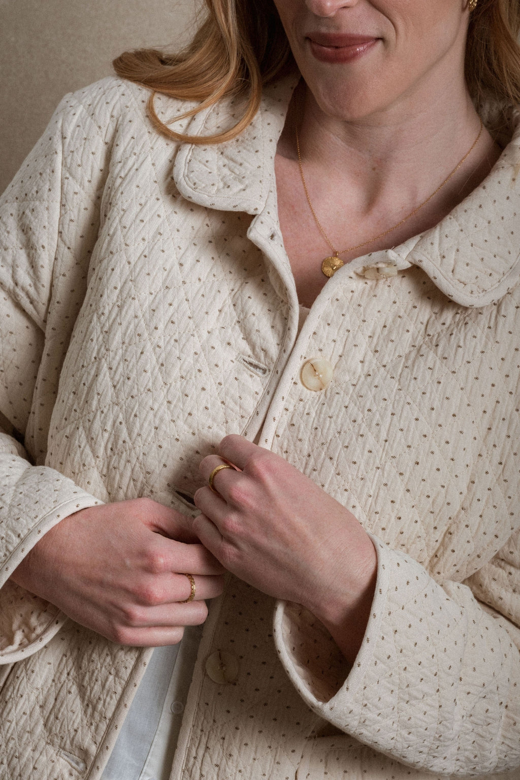 - The Margot Jacket is a medium-weight quilted layer crafted for both comfort and style. Cream turtle buttons and front pockets add thoughtful, practical details, while the structured yet soft fabric makes it easy to wear over your favorite sweaters or everyday outfits. A cozy, timeless staple, the Margot Jacket blends classic charm with functional design for season-long layering.