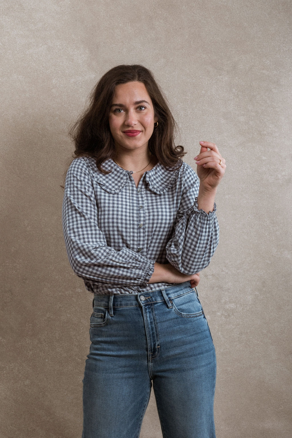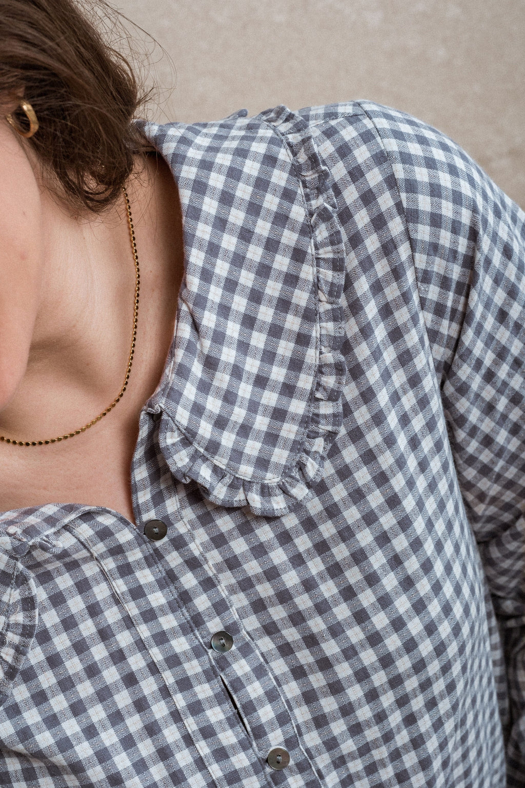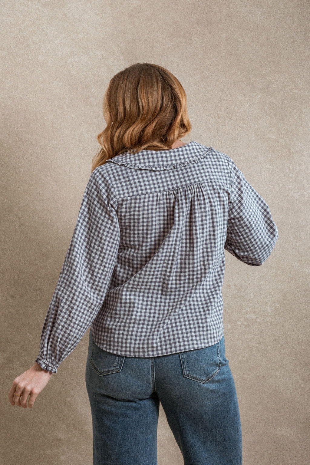 - The Kimber long sleeve is a delicate and charming long-sleeve piece that adds a touch of sweetness to any outfit. Made from lightweight, breathable fabric, it features functional mother-of-pearl buttons for an elegant finish and a Peter Pan collar adorned with playful ruffles, creating a feminine and timeless look.