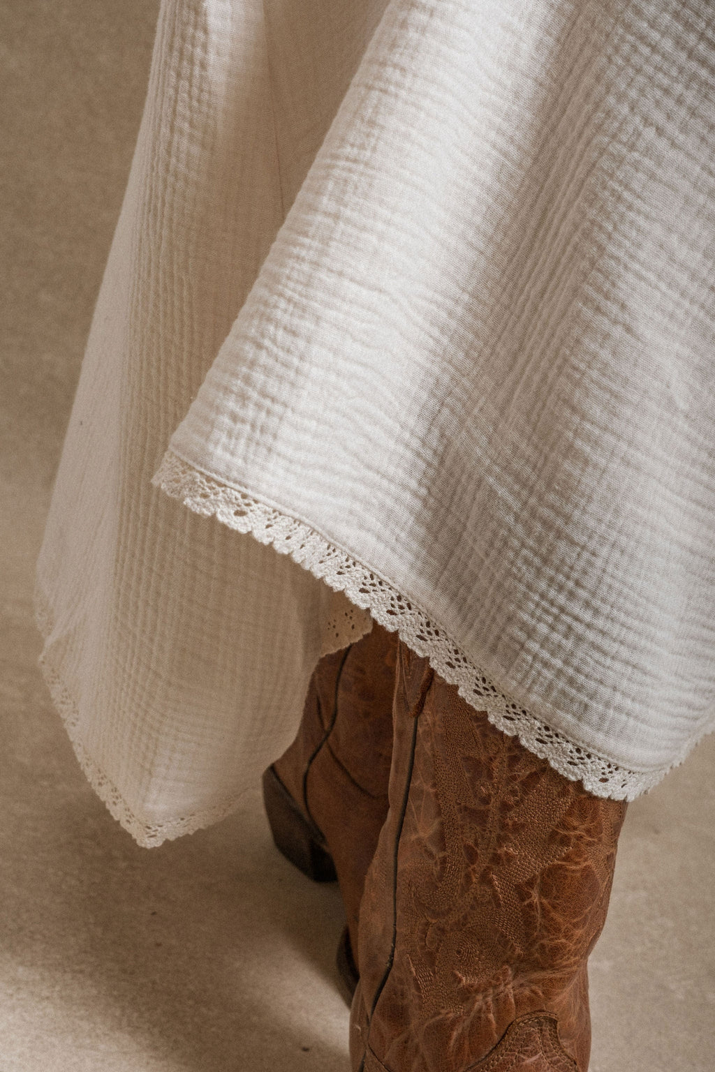 - Embrace effortless style and comfort with the Loveland Dress, crafted from soft, breathable cotton gauze that feels light and airy all day long. Designed with delicate smocking and a flattering V-line at the waist as well as lined, this dress gently defines your silhouette while providing a flexible fit. This piece is maternity and nursing friendly.