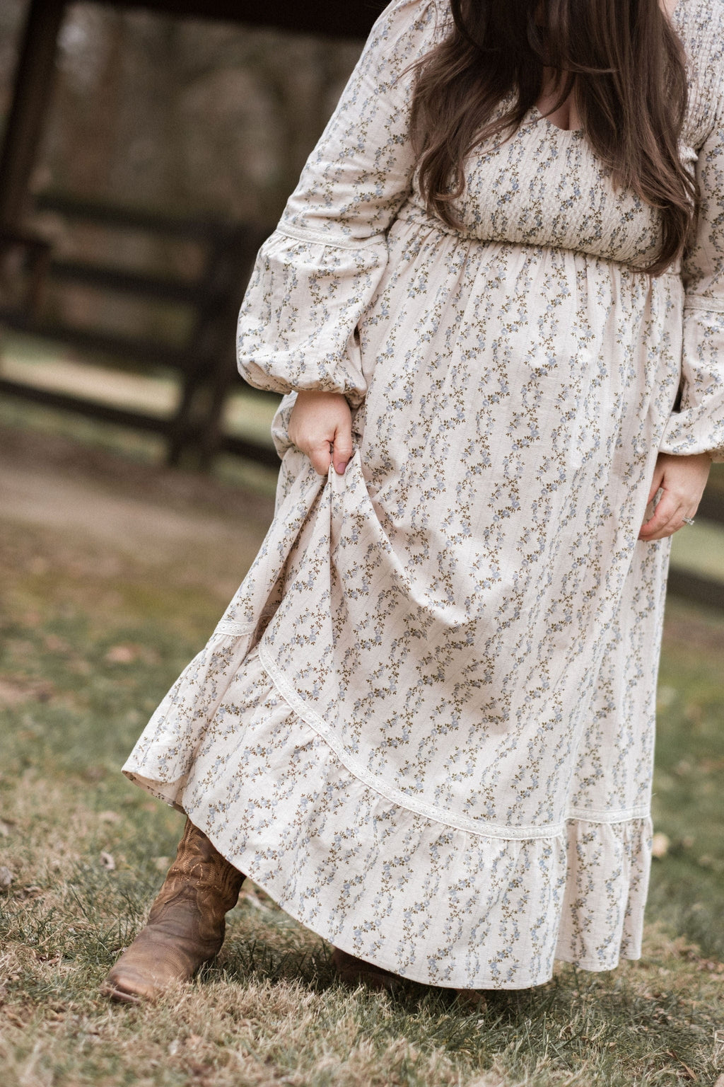 • The Sylvan Dress is designed with comfort and beauty in mind. Crafted from a thicker, ultra-soft fabric, it offers a cozy yet refined feel that’s perfect for everyday wear or special moments. Thoughtfully made to be maternity and nursing friendly, this dress adapts with you while maintaining a flattering silhouette. Delicate lace detailing at the elbow and a graceful lace tier near the hem add a romantic touch, while elastic wrists provide a comfortable, easy fit. The Sylvan Dress blends practicality with timeless elegance.