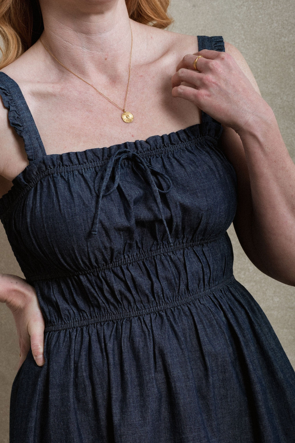 The Windsor Dress in chambray is designed for comfort, versatility, and everyday wear. With a soft, stretchy bust and waistband, it offers a flexible fit that works beautifully during pregnancy, postpartum, and beyond. A decorative, non-functional tie at the bust adds a cute, feminine touch, while practical side pockets.